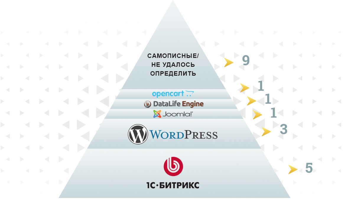 Закономерность для малого и среднего бизнеса не нарушена: выделяются сайты на 1С-Битрикс и WordPress, остальные CMS размазаны в единичных экземплярах. Около 40% из основной группы сайтов используют самописные решения.