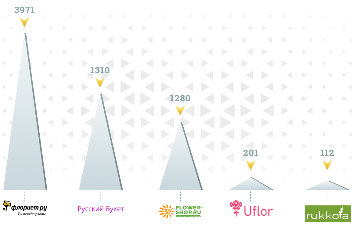 Ассортимент товаров измеряется в тысячах и у топовых сайтов составляет 3 000 – 6 000 различных композиций. При развитии сайта florist-express.ru мы целенаправленно расширяли ассортиментную матрицу для того, чтобы соответствовать конкурентам.