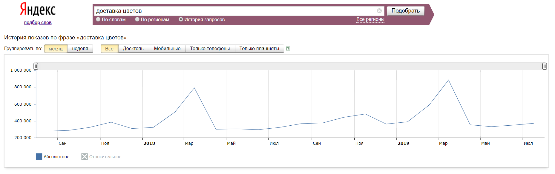 В рамках одного домена также собирают значительный трафик разделы из категорий «букеты по событиям» (8 марта, новый год, 9 мая, день учителя) и «букеты по составу» (розы, хризантемы, тюльпаны, герберы, микс).