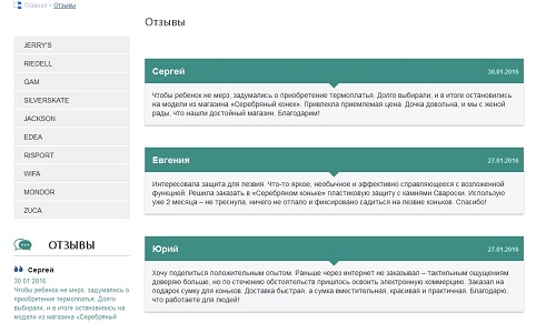 Модуль с отзывами покупателей расположен на отдельной странице сайта, а также последние отзывы выводятся в левом сайдбаре